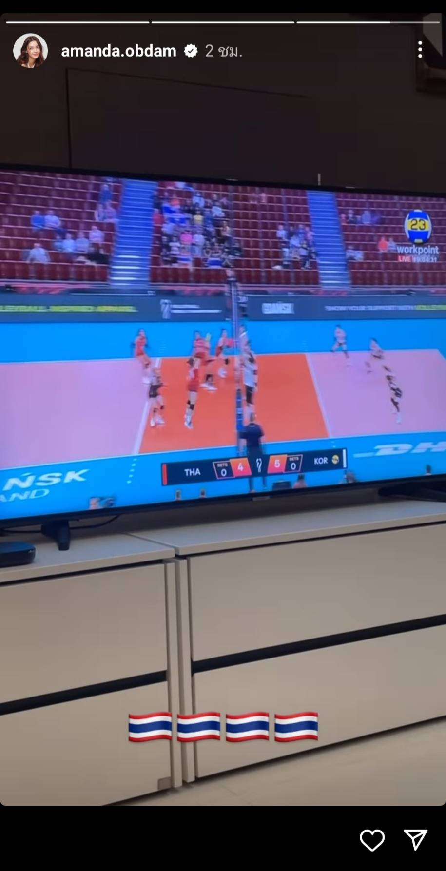 ด้าน "อแมนด้า ออบดัม" ก็ได้โพสต์สตอรี่อินสตาแกรม ขณะกำลังดูารแข่งขัน พร้อมส่งเสียงเชียร์สนั่นบ้าน