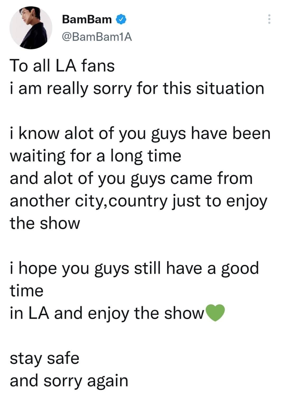 สุดท้ายทางผู้จัดงานชี้แจงว่า แบมแบม และ ศิลปินอีกหลายท่านไม่สามารถเดินทางไปแสดงในงานครั้งนี้ได้ ไม่ว่าจะเป็น Kai / Taeyeon / Lapillusd / Jeon Somi / Zion T ใครที่จะประสงค์จะคืนบัตรก็สามารถทำได้ ทางด้าน แบมแบม ก็ได้ออกมาโพสต์ข้อความขอโทษผ่านทวิตเตอร์มีใจความว่า