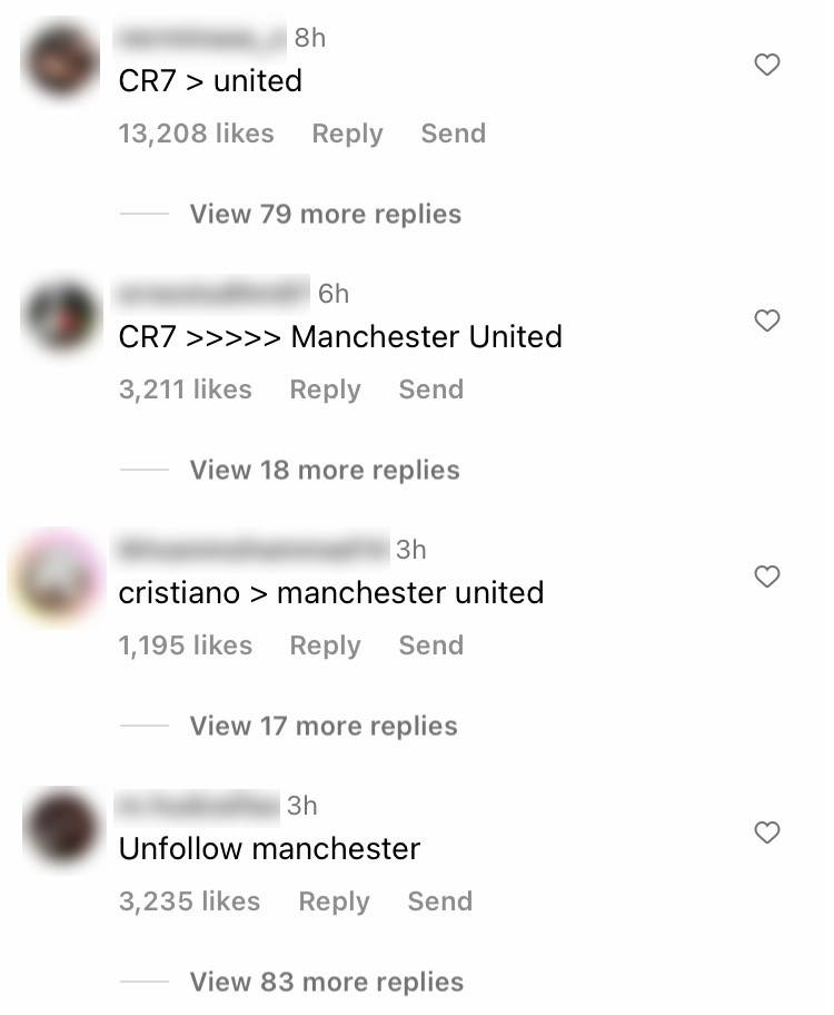 ขณะที่อีกหลายคอมเมนต์ของแฟนคลับต่างแดน ต่างมองว่า “โรนัลโด้” หรือ “CR7” นั้นยิ่งใหญ่เกินกว่า “แมนยู” ถ้าความเห็นไม่ตรงกันก็ควรแยกทาง และจะยังติดตามเชียร์ “โรนัลโด้” ต่อไป โดยอีกหลายคอมเมนต์ประกาศอัลฟอลโลว์เลิกติดตาม “แมนยู” ทันที ในส่วนของแฟนบอลไทยเองก็มองว่า เมื่อไปกันไม่ได้ก็แยกทาง ขณะที่บางเสียงวิจารณ์ “โรนัลโด้” ว่าอีโก้สูง