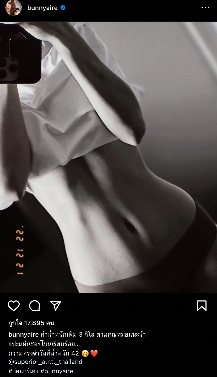 ล่าสุด "แอร์ ภัณฑิลา" ได้ออกมาโพสต์ภาพหุ่นของตัวเอง พร้อมแคปชั่นว่า "ทำน้ำหนักเพิ่ม 3 กิโล ตามคุณหมอแนะนำ แปะแผ่นฮอร์โมนเรียบร้อย… ความทรงจำวันที่น้ำหนัก 42 @superior_a.r.t._thailand #อ่อแอร์เอง #bunnyaire"