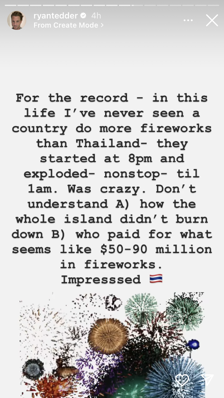 เรียกว่าอะเมซิ่งยิงยาวตลอดทั้งคืนเพราะ “ไรอัน เท็ดเดอร์” ลงภาพพลุปีใหม่ในภูเก็ตใน IG Story ไว้เยอะมาก ก่อนที่ช่วงเช้าจะโพสต์อวยพรปีใหม่กับแฟนๆ กับวิวทิวทัศน์ในภูเก็ตพร้อมแคปชั่นว่า “สำหรับใครที่ยังอยู่ในปี 2022 กันอยู่ นี่เป็นภาพจากปี 2023 นะครับ ทุกอย่างจะโอเคในปีนี้ สวัสดีปีใหม่ครับ”