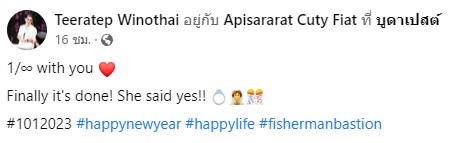 โดยได้เผยแคปชั่นว่า "1/∞ with you Finally it's done! She said yes!! #1012023 #happynewyear #happylife #fishermanbastion"