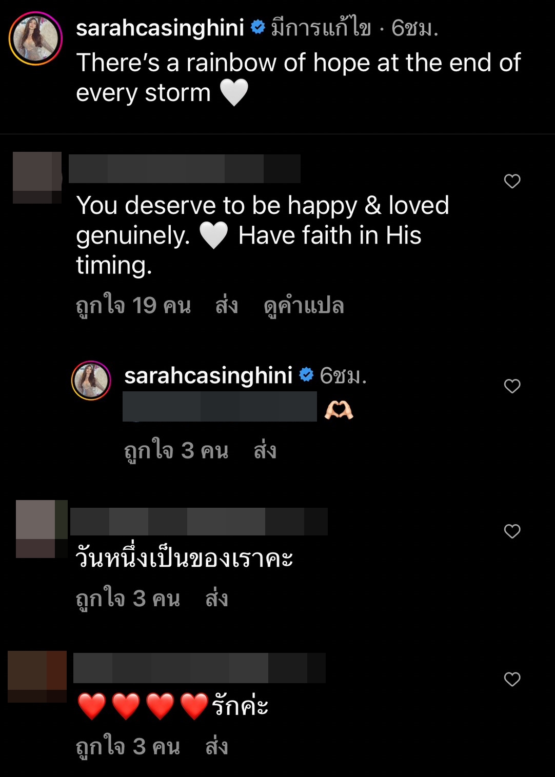 ล่าสุด ซาร่า ได้โพสต์ภาพผ่านอินสตาแกรมส่วนตัว เป็นภาพของตัวเอง และภาพสุดท้ายเป็นภาพคู่ของเธอกับสามี "แดริล ยัง" พร้อมระบุข้อความว่า "There’s a rainbow of hope at the end of every storm" (สายรุ้งแห่งความหวังจะปรากฏทุกครั้งที่มรสุมพัดผ่าน) และแท็กไปยังอินสตาแกรมของหนุ่ม แดริล อีกด้วย ซึ่งก็มีแฟนๆ เข้ามาคอมเมนต์ส่งกำลังใจให้เธอกันเป็นจำนวนมาก