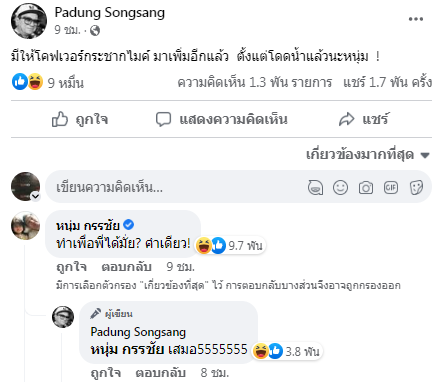 งานนี้ทำเอา "แจ๊ส ชวนชื่น" ถึงกับโพสต์ข้อความเลยว่า "มีให้คัฟเวอร์กระชากไมค์มาเพิ่มอีกแล้ว ตั้งแต่โดดน้ำแล้วนะหนุ่ม!" จากนั้น "หนุ่ม กรรชัย" ก็ได้มาตอบกลับคอมเมนต์ว่า "ทำเพื่อพี่ได้ไหม? คำเดียว!" ซึ่งหนุ่มแจ๊สเองก็ตกปากรับคำว่า "เสมอ5555555" เรียกเสียงหัวเราะจากแฟนๆ ที่เข้ามาคอมเมนต์รอชมกันเป็นจำนวนมาก
