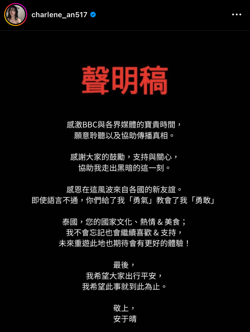 โดยระบุว่า "ขอขอบคุณ BBC และทุกท่าน สื่อทุกสื่อจากไต้หวัน ที่ได้ร่วมสละเวลาอันมีค่าของทุกท่าน เพื่อรับฟังและแชร์ความจริง"