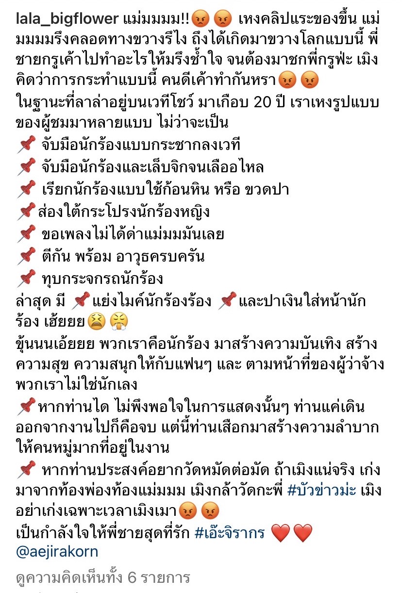 ล่าสุดมีแย่งไมค์นักร้องร้อง และปาเงินใส่หน้านักร้อง เฮ้ยยย คุณเอ้ย! พวกเราคือนักร้อง มาสร้างความบันเทิง สร้างความสุข ความสนุกให้กับแฟนๆ และตามหน้าที่ของผู้ว่าจ้าง พวกเราไม่ใช่นักเลง