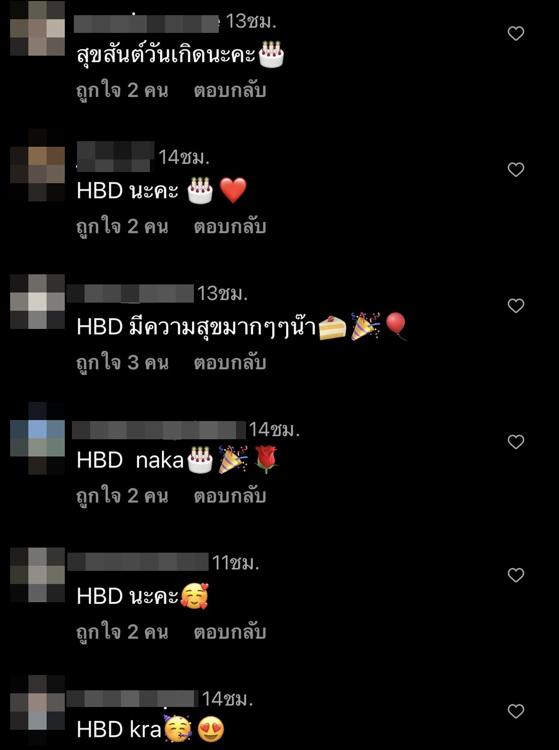 ท่ามกลางคอมเมนต์แสดงความยินดีและอวยพรวันเกิด อย่าง บัว นลินทิพย์ "น่ารักมากกก Happy birthday ด้วยน้า" , เดียร์น่า happy birthday naka" , โยเกิร์ต "Too cute hbd กระทิงน้องรัก" ด้านกระทิง ก็ได้เข้ามาตอบคอมเมนต์เป็นอิโมจิเขิน...