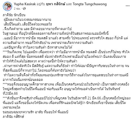 ดังนั้นเราจึงจะรับร่างพี่แอมป์ไปบำเพ็ญกุศล ในวันอังคารที 21 มีค.66..เป็นกุศลยิ่งใหญ่ของพี่แอมป์ แม่จึงขอชี้แจงให้ชัดเจน เพื่อคนที่รักแอมป์จะได้รู้ว่า นักเขียนที่เขาชื่นชม เสียชีวิตเพราะเหตุใด