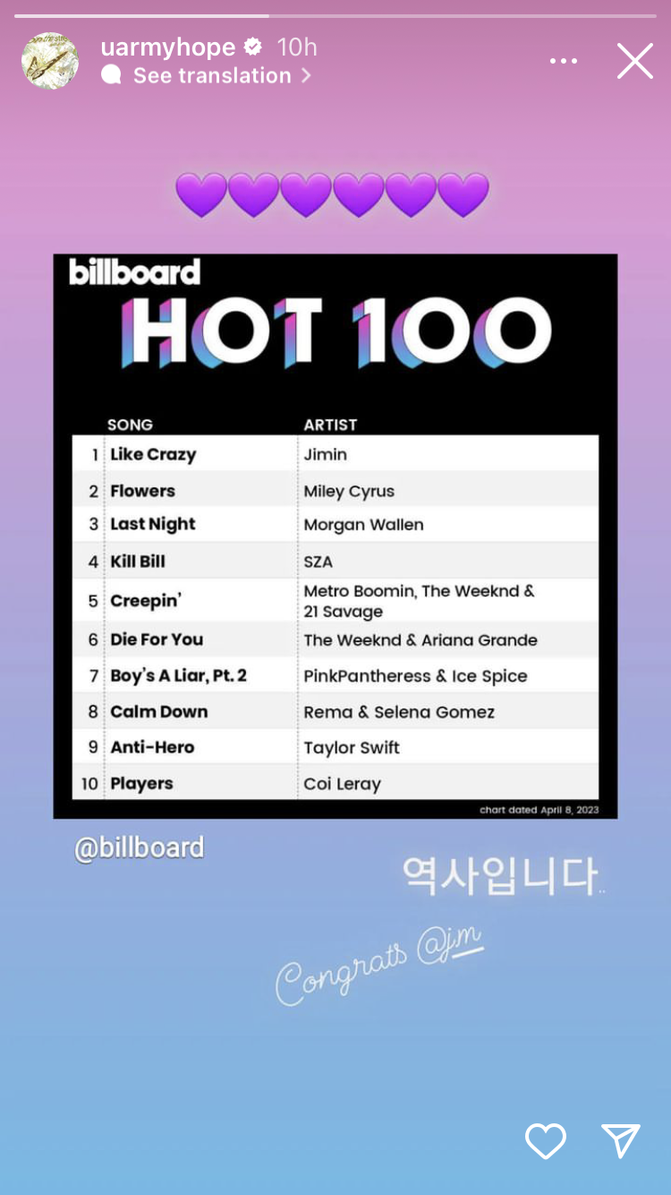 แสดงความยินดีกับ “จีมิน” หรือ “พัคจีมิน” (Jimin) สมาชิกบอยแบนด์วง “บีทีเอส” (BTS) วัย 27 ปี จากเกาหลีใต้ ที่ล่าสุดพาผลงานเพลง Like Crazy ซึ่งเป็นเพลงเอกจากผลงานโซโล่อัลบั้มที่ใช้ชื่อว่า FACE คว้าแชมป์ Billboard Hot 100 ซึ่งเป็นชาร์ตใหญ่สุดในการจัดอันดับเพลงฮิตประจำสัปดาห์ของสหรัฐอเมริกา (คลิกฟังเพลง Like Crazy)