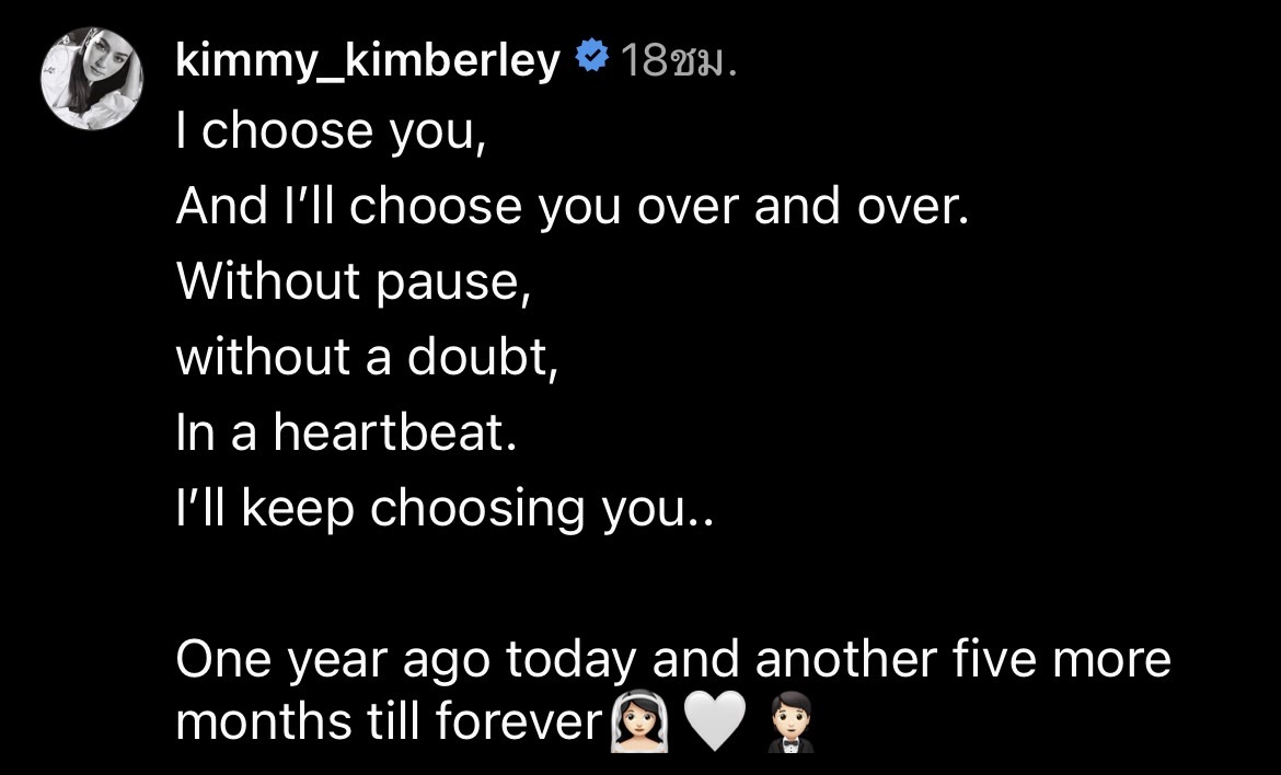 โดยนางเอกสาว คิมเบอร์ลี่ แชร์โมเมนต์ครบรอบ 1 ปี ที่ถูกขอแต่งงาน คลิปหวานพร้อมข้อความว่า " I choose you, And I’ll choose you over and over. Without pause, without a doubt, In a heartbeat. I’ll keep choosing you.. One year ago today and another five more months till forever" และยังมีภาพที่ทั้งคู่ฉลองกันหวานฉ่ำอีกด้วย