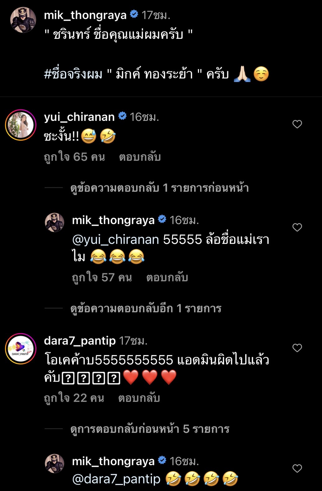 รีบแจงด่วน!! หวั่นแฟน ๆ เข้าใจผิด... พระเอกหนุ่ม "มิกค์ ทองระย้า" หลังมีโพสต์ข้อความนึงว่า "หลายคนไม่รู้! มิกค์ ทองระย้า ชื่อจริงมีชื่อว่า ชรินทร์" ซึ่งพระเอกหนุ่ม มิกค์ รีบโพสต์ชี้แจง ว่า "ชรินทร์ ชื่อคุณแม่ผมครับ" ชื่อจริงผม มิกค์ ทองระย้า ครับ"