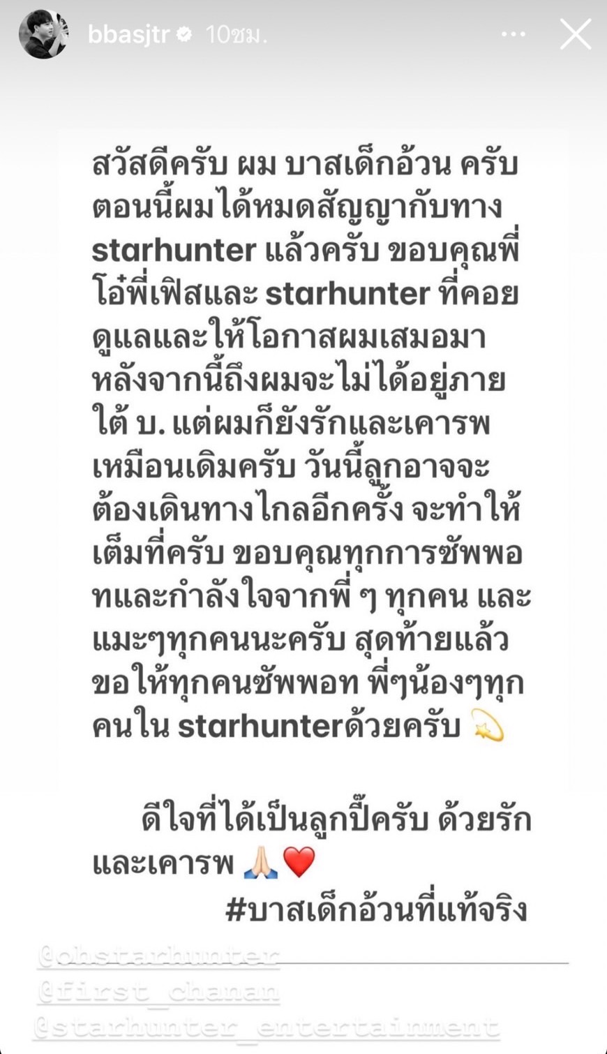 ล่าสุดหนุ่มบาส ได้โพสต์ประกาศเกี่ยวกับการสิ้นสุดสัญญากับทางค่าย พร้อมขอบคุณที่ดูและให้โอกาสมาโดยตลอด โดยระบุข้อความว่า "สวัสดีครับ ผม บาสเด็กอ้วน ครับ ตอนนี้ผมได้หมดสัญญากับทางstarhunter แล้วครับ ขอบคุณพี่โอ๋พี่เฟิสและ starhunter ที่คอยดูแลและให้โอกาสผมเสมอมา หลังจากนี้ถึงผมจะไม่ได้อยู่ภายใต้ บ. แต่ผมก็ยังรักและเคารพเหมือนเดิมครับ วันนี้ลูกอาจจะต้องเดินทางไกลอีกครั้ง จะทำให้เต็มที่ครับขอบคุณทุกการซัพพอทและกำลังใจจากพี่ ๆ ทุกคน และแมะๆทุกคนนะครับ สุดท้ายแล้วขอให้ทุกคนซัพพอท พี่ๆน้องๆทุกคนใน starhunterด้วยครับ ดีใจที่ได้เป็นลูกปี๊ครับ ด้วยรักและเคารพ #บาสเด็กอ้วนที่แท้จริง"