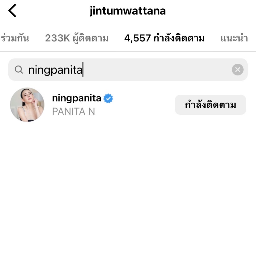 แต่ล่าสุดเมื่อเข้าไปส่องอินสตาแกรมของ "หนิง ปณิตา" เธอได้อันฟอลโลว์ สามี "จิน จรินทร์" ซึ่งเมื่อไปเช็กอินสตาแกรมของ สามีอย่าง จิน จรินทร์ ก็ยังพบว่าติดตาม หนิง ปณิตา อยู่เหมือนเดิม งานนี้บทสรุปของเรื่องราวครั้งนี้จะไปจบที่ตรงจุดไหน คงต้องรอฟัง จาก หนิง เอง . .