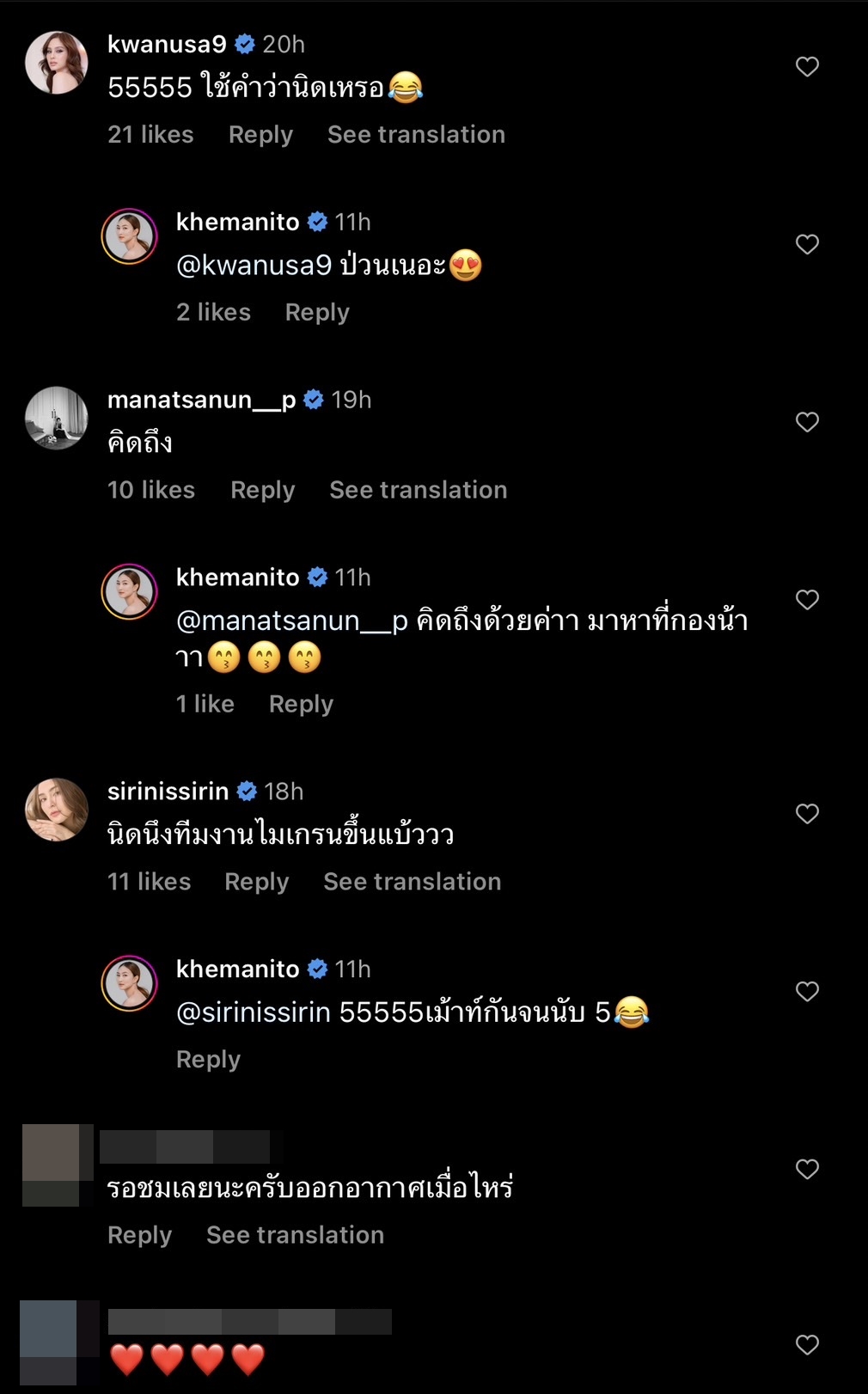 ถัดมาสาวขวัญ ก็ได้เข้ามาคอมเมนต์ว่า "55555 ใช้คำว่านิดเหรอ" ด้านสาวชิปปี้ คอมเมนต์ว่า "นิดนึงทีมงานไมเกรนขึ้นแล้ววว" และทางสาวโดนัท ก็ได้เข้ามาคอมเมนต์สั้นๆ ว่า "คิดถึง"