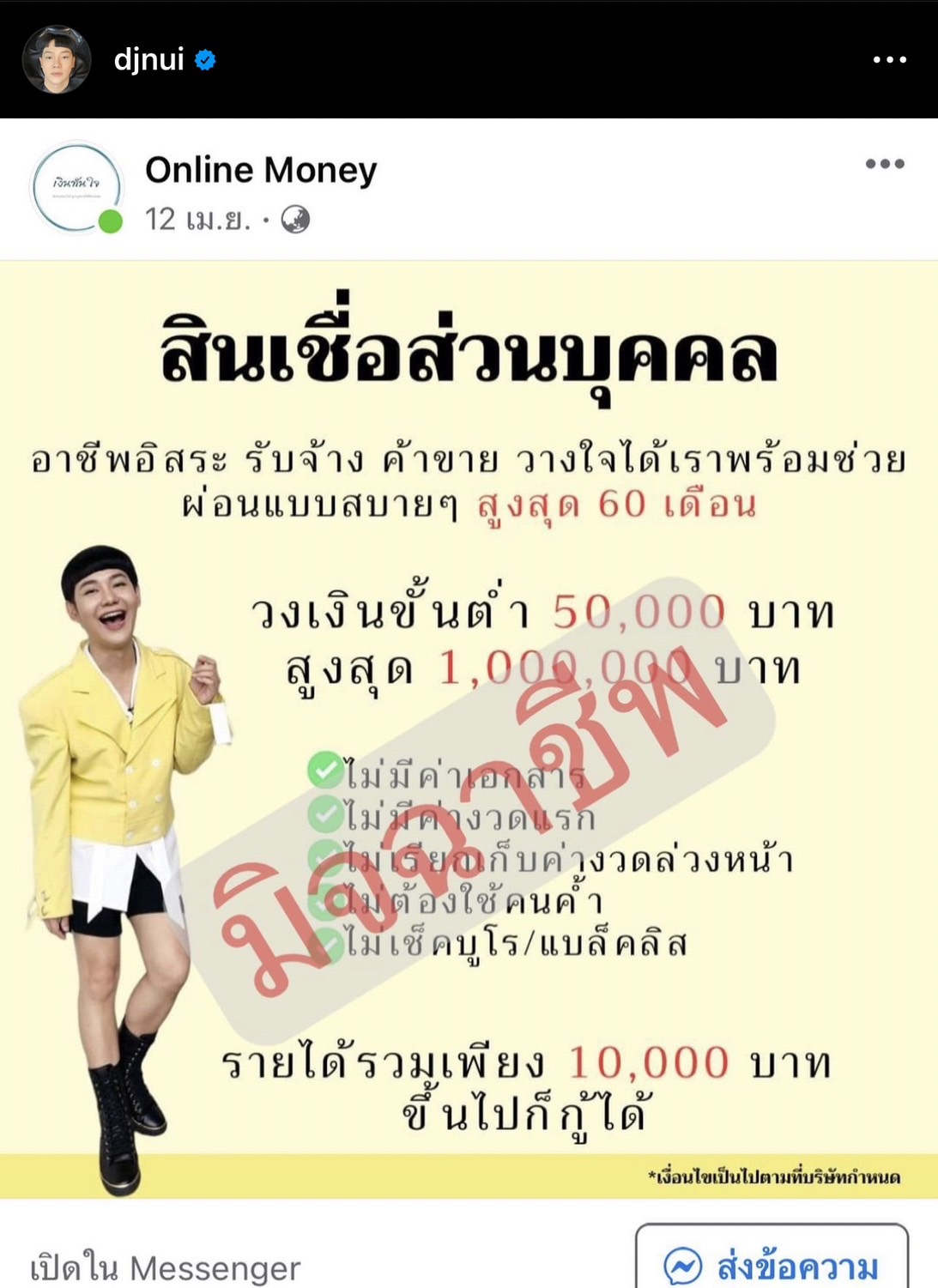 ช่วงนี้เป็นช่วงที่มิจฉาชีพออกระบาดเยอะ และมีวิธีการหลอกลวงสารพัดรูปแบบ ซึ่งมีคนจำนวนมากต้องตกเป็นเหยื่อมิจฉาชีพเหล่านี้ ไม้เว้นแม้แต่เหล่าคนบันเทิงก็โดนไปไม่ใช่น้อย ล่าสุดดีเจชื่อดัง "นุ้ย ธนวัฒน์ ประสิทธิสมพร" ก็ออกมาโพสต์ภาพข้อความแจ้งข่าวสารหลังจากถูกแอบอ้างใช้ชื่อเสียงและรูปภาพ เปิดเพจปล่อยสินเชื่อส่วนบุคคล