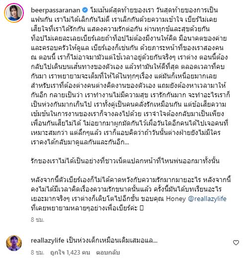 หลังจากนี้ตัวเบียร์เองก็ไม่ได้คาดหวังกับความรักมากมายอะไร หลังจากนี้คงไม่ได้มีเวลาคิดเรื่องความรักขนาดนั้นแล้ว ครั้งนี้มันได้บทเรียนอะไรเยอะมากจริงๆ เราต่างก็เติบโตไปอีกขั้น ขอบคุณ Honey @reallazylife ที่เคยพยายามหลายๆอย่างเพื่อเบียร์ค่ะ"