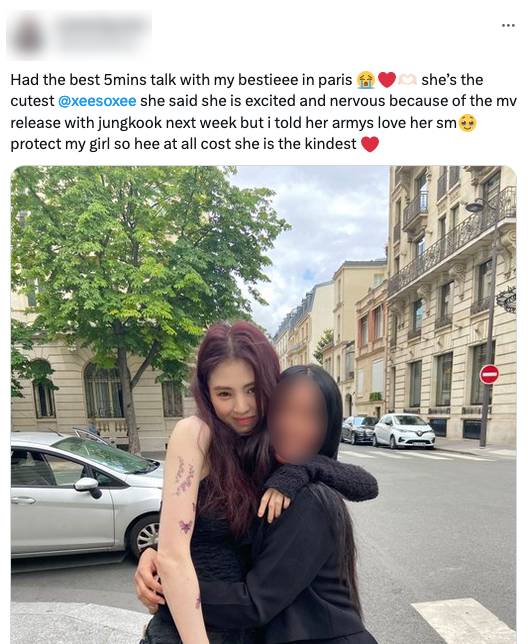 ไม่เพียงเท่านั้น ยังมีโพสต์จากแฟนคลับในฝรั่งเศสอีกคนที่บังเอิญเจอกับ “ฮันโซฮี” และได้พูดคุยกับเธออยู่ 5 นาที ซึ่งทางเจ้าของโพสต์บอกว่า เป็น 5 นาทีที่ดีที่สุดในชีวิต เพราะนางเอกคนนี้เป็นคนที่ทั้งน่ารักและจิตใจดีแบบสุดๆ โดย “ฮันโซฮี” ได้เล่าให้เธอฟังตอนนั้นว่ารู้สึกตื่นเต้นและกังวลมาก เพราะมิวสิควิดีโอที่เล่นให้กับ “จองกุก” (Jungkook) วง “บีทีเอส” (BTS) กำลังจะปล่อยออกมาแล้ว ด้วยความที่แฟนคลับวง BTS มีจำนวนมาก เธอจึงทั้งกลัวและกังวลไม่น้อย ซึ่งทางแฟนคลับคนนี้ก็ได้ให้กำลังใจไปว่า ไม่ต้องกลัวนะออนนี่ (พี่สาว) เพราะคุณทำได้ดีมากอยู่แล้ว ทุกคนรักคุณ และแฟนๆ จะคอยปกป้องคุณเอง!!