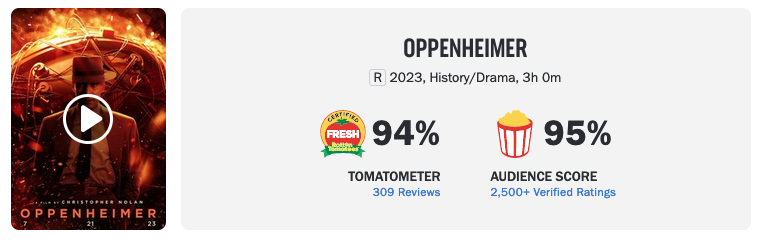 ขณะที่ Barbie ได้จากนักวิจารณ์และคนดูที่ 90 เปอร์เซ็นต์เต็มร้อยเท่ากัน สะท้อนว่าผลงานตีตลาดได้กว้างมาก ส่วน Oppenheimer นักวิจารณ์ให้ 94 เปอร์เซ็นต์เต็มร้อย ส่วนคนดูให้ 95 เปอร์เซ็นต์ ถือว่า “คริสโตเฟอร์ โนแลน” ยังคงทำหนังโดนใจแฟนๆ ได้เช่นเคย