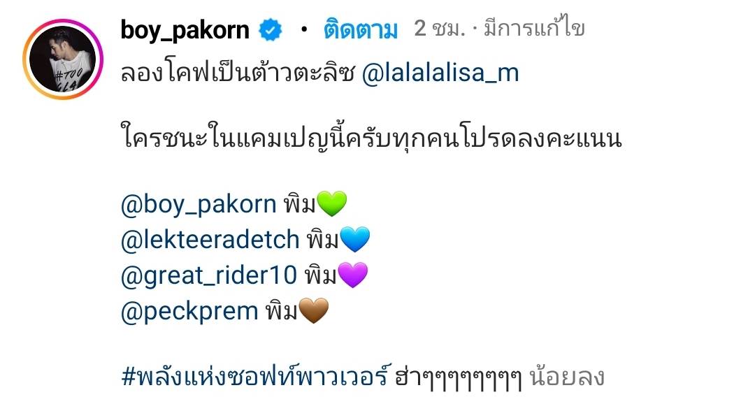 ซึ่ง "บอย ปกรณ์" ได้โพสต์ภาพ พร้อมแคปชั่นว่า "ลองโคฟเป็นต้าวตะลิซ @lalalalisa_m ใครชนะในแคมเปญนี้ครับทุกคน โปรดลงคะแนน #พลังแห่งซอฟ์พาวเวอร์ ฮ่าๆๆๆๆๆๆๆ" ด้านแฟนๆเข้าไปคอมเมนต์แซวว่า ทำไมทั้ง 4 หนุ่ม ไม่ใส่ผ้าไทยด้วย, องศาท่ายืน มุมเป๊ะมาก และคอมเมนต์น่ารักๆอีกมากมาย งานนี้แฟนๆคิดว่าใครเหมือนสุดเข้าไปคอมเมนต์โหวตกันเลย