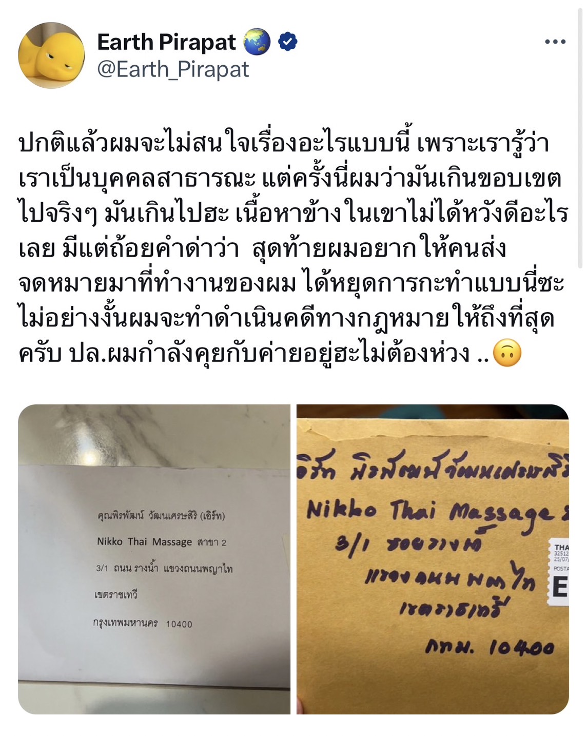 โดยหนุ่มเอิร์ทได้โพสต์รูปซองจดหมายที่ส่งมาลงในทวิตเตอร์ พร้อมเขียนข้อความว่า “ตอนนี้ผมรู้ต้นตอคนส่งแล้วนะครับ เข้าข่ายคุกคามครับ ถ้าไม่หยุดการกระทำนี้ ผมขออนุญาตดำเนินการทางกฎหมายให้ถึงที่สุดนะครับ พร้อมเขียนคอมเมนต์ใต้โพสต์ว่า 'โพสต์หน้าผมจะโพสต์ข้อความข้างในซองจดหมายด้วยนะครับ :) ถ้ายังไม่หยุดอีก'