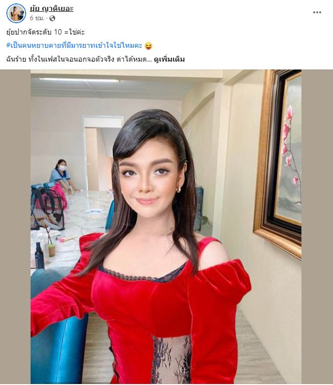 ต่อมาเธอก็ได้โพสต์อีกว่า "ยุ้ยปากจัดระดับ 10 =ใช่ค่ะ #เป็นคนหยาบคายที่มีมารยาทเข้าใจใช่ไหมคะ ฉันร้าย ทั้งในเฟสในจอนอกจอตัวจริง ด่าได้หมด ไอ..ไอ..เหมือนคนอื่น แต่ฉันมีกาลเทศะ สมควรใช้ภาษาแบบไหนกับใคร ไม่ใช่ถ่อยไปวันๆ"