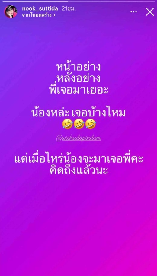 โดย "นุ๊ก สุทธิดา" ได้โพสต์ข้อความผ่านทางอินสตาแกรมสตอรี่ของตัวเองซึ่งมีข้อความที่เขียนว่า "หน้าอย่าง หลังอย่าง พี่เจอมาเยอะ น้องหล่ะ เจอบ้างไหม @wichudapindum แต่เมื่อไรน้องจะมาเจอพี่คะ คิดถึงแล้วนะ"