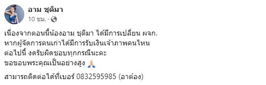 ล่าสุดสาวอาม โพสต์แจ้งข่าวว่าได้เปลี่ยนผู้จัดการ ผ่านเฟซบุ๊กส่วนตัวว่า "เนื่องจากตอนนี้น้องอาม ชุติมา ได้มีการเปลี่ยน ผจก. หากผู้จัดการคนเก่าได้มีการรับเงินเจ้าภาพคนไหน ต่อไปนี้ งดรับผิดชอบทุกกรณีนะคะ ขอขอบพระคุณเป็นอย่างสูง สามารถติดต่อได้ที่เบอร์ 0832595985 (อาต๋อง)"