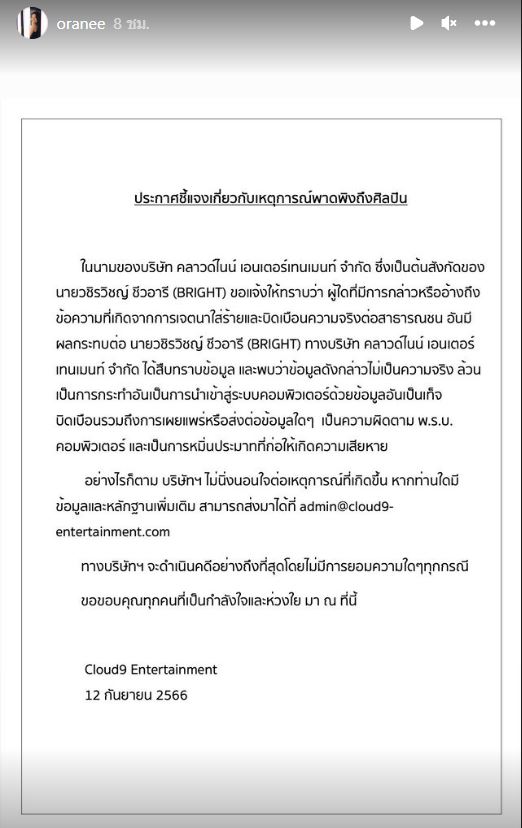 อันมี ผลกระทบต่อ นายวชิรวิชญ์ ชีวอารี (BRIGHT) ทางบริษัท คลาวด์ไนน์ เอนเตอร์เทนเมนท์ จำกัต ได้สืบทราบข้อมูล และพบว่าข้อมูลดังกล่าวไม่เป็นความจริง ล้วนเป็นการกระทำอันเป็นการนำเข้าสู่ระบบคอมพิวเตอร์ด้วยข้อมูลอันเป็นเท็จ บิดเบือนรวมถึงการเผยแพร่หรือส่งต่อข้อมูลใดๆ เป็นความผิดตาม พ.ร.บ. คอมพิวเตอร์ และเป็นการหมิ่นประมาทที่ก่อให้กิดความเสียหาย