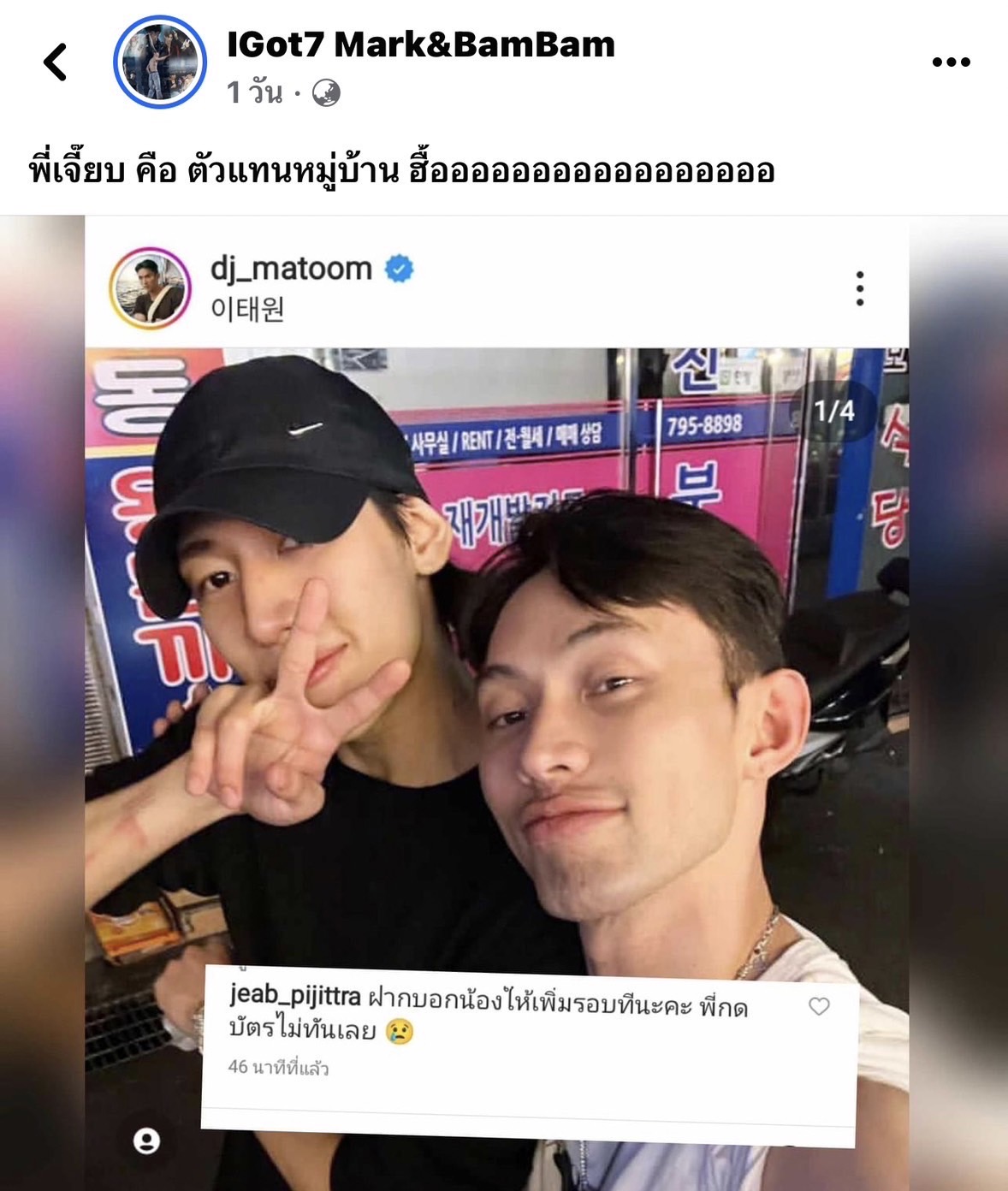 และไม่พลาดที่อากาเซ่ตัวแม่อย่าง “เจี๊ยบ พิจิตตรา สิริเวชชะพันธ์” ที่เมื่อเวลาหนุ่มๆ GOT7 มาจัดคอนเสิร์ตที่ไทยทีไร เจ้าตัวก็ไม่พลาดที่จะกดบัตรเองตามวิถีแฟนคลับ แต่งานนี้สาวเจี๊ยบถึงกับต้องปาดน้ำตาเสียดายแบบขั้นสุด เพราะกดบัตรครั้งนี้ไม่ทัน จนต้องเข้าไปคอมเมนต์เป็นตัวแทนหมู่บ้านรูปคู่ที่ “ดีเจมะตูม” ไปกินข้าวกับ “แบมแบม” ที่ประเทศเกาหลี โดยฝากข้อความผ่านไปยัง “มะตูม” ให้บอกกับ อีกฝ่ายด้วยว่า “ฝากบอกน้องว่าให้เพิ่มรอบทีนะคะ พี่กดบัตรไม่ทันเลย” งานนี้ทำเอาแฟนๆ ต่างกดไลก์ให้กับสาวเจี๊ยบกันอย่างมากมายที่ได้เป็นตัวแทนหมู่บ้านบอกกับ “แบมแบม” แทนทุกคนที่กดบัตรไม่ทัน