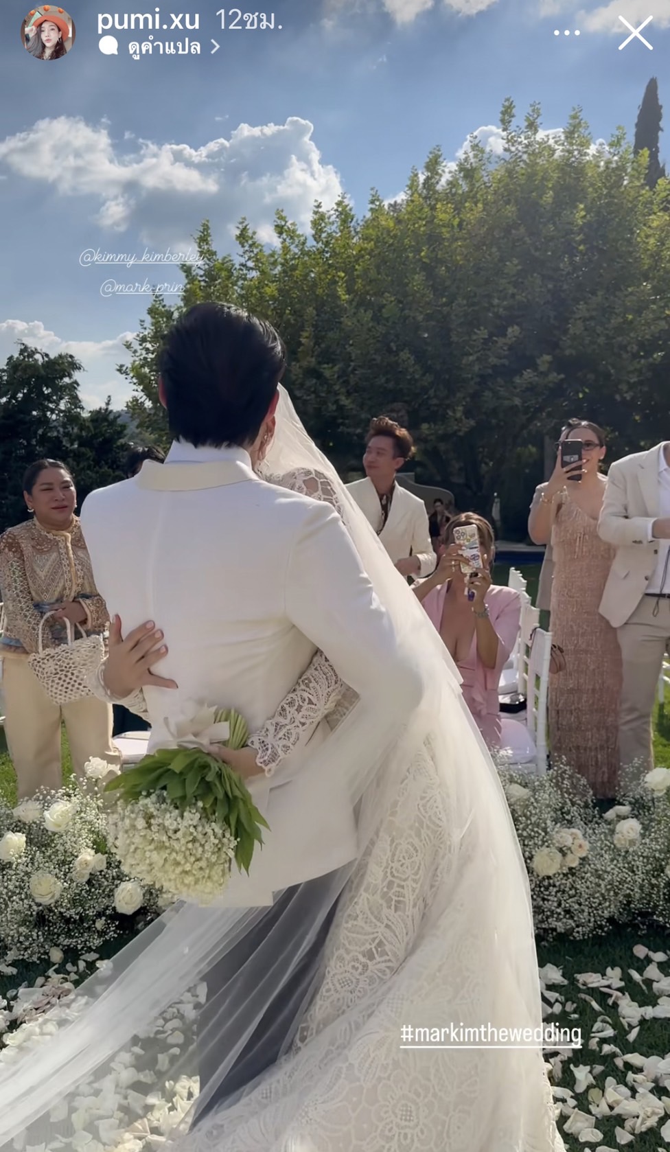 งานนี้เจ้าสาว คิมเบอร์ลี่ มาในชุดวิวาห์สีขาวแต่งลูกไม้ กระโปรงบานฟูฟ่อง งดงามดุจเจ้าหญิง ส่วนเจ้าบ่าว หมาก ปริญ มาในชุดสูทสีขาว กับกางเกงสีดำ ซึ่งทั้งคู่ก็ควงคู่กันมาบนทางเดินที่ปูด้วยดอกไม้ ส่วนช็อตเด็ดคงอยู่ที่การจูบทั้งงานของสามี...