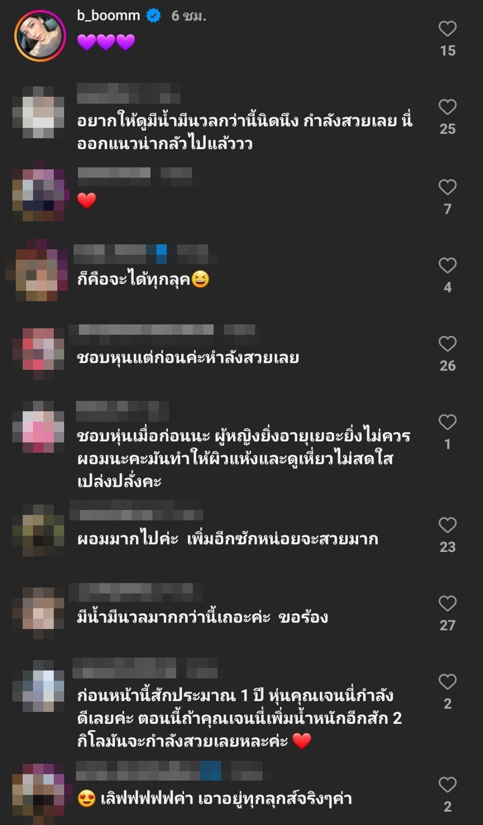 ล่าสุดกับรูปในชุดเดรสสุดเซ็กซี่ปนน่ารักที่โชว์หลังที่ “เจนี่” ได้โพสต์ลงอิสตาแกรมนั้นแทนที่แฟนๆ จะเข้าไปคอมเมนต์ชื่นชมความแซ่บของคุณแม่ลูกหนึ่ง แต่กลับเข้าไปคอมเมนต์แสดงความเป็นห่วง อยากให้นักแสดงสาวเร่งเพิ่มน้ำหนักว่า “ด้วยความเป็นห่วงค่ะ คุณผอมแห้งมากเกินไป แห้งแกรนจนกระดูกทุกส่วนโผล่ เพิ่มเนื้อสักนิดจะแลดูสุขภาพดี เพรียวสวยเลยค่ะ , การที่หุ่นลีนไขมันลดมันเป็นสิ่งที่ดีสำหรับมนุษย์เรา#แม้จะออกกำลังกายเล่นเวทเทรนนิ่งสม่ำเสมอ คุมอาหารการกินแบบเป๊ะๆ ก็ตาม #แต่ถ้าจะลีนขนาดนี้จน fat ต่ำเกินไปมันก็ไม่เป็นผลดีสำหรับสุขภาพแบบนี้เค้าเรียกว่าลีน รีดไขมันจนโครงสร้างแห้งกระดูกโผล่เวลาแต่งตัวเดินแบบมันอาจดูเข้าทุกลุค แต่ร่างกายเราก็ไม่ควรจะลีนแห้งจนเกินไป , คือส่วนตัวชอบคุณเจนนี่มากค่ะชอบตั้งนานแล้วทุกวันนี้ก็ชอบค่ะ แต่แค่รู้สึกว่าผอมเกินไปนะคะมันจะดูไม่สวยเลยผอมแบบสุขภาพแข็งแรงก็จริงแต่ว่าผอมเกินไปค่ะอยากให้มีน้ำมีนวลกว่าอีกหน่อยนะคะ , ชอบหุ่นเมื่อก่อนนะ ผู้หญิงยิ่งอายุเยอะยิ่งไม่ควรผอมนะคะมันทำให้ผิวแห้งและดูเหี่ยวไม่สดใสเปล่งปลั่งคะ เป็นต้น