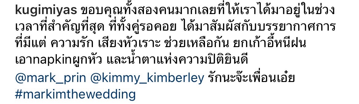 โดย หนุ่มณเดชน์ ได้มีการเผยถึงความในใจสุดซึ้งต่อคู่เจ้าบ่าวเจ้าสาวและโพสต์ภาพสุดน่ารักลงทางอินสตาแกรมส่วนตัว @kugimiyas ระบุข้อความว่า 'ขอบคุณทั้งสองคนมากเลยที่ให้เราได้มาอยู่ในช่วงเวลาที่สำคัญที่สุด ที่ทั้งคู่รอคอย ได้มาสัมผัสกับบรรยากาศการที่มีแต่ความรัก เสียงหัวเราะ ช่วยเหลือกัน ยกเก้าอี้หนีฝน เอาnapkinผูกหัว และน้ำตาแห่งความปีติยินดี @mark_prin @kimmy_kimberley รักนะจ๊ะเพื่อนเอ๋ย #markimthewedding'