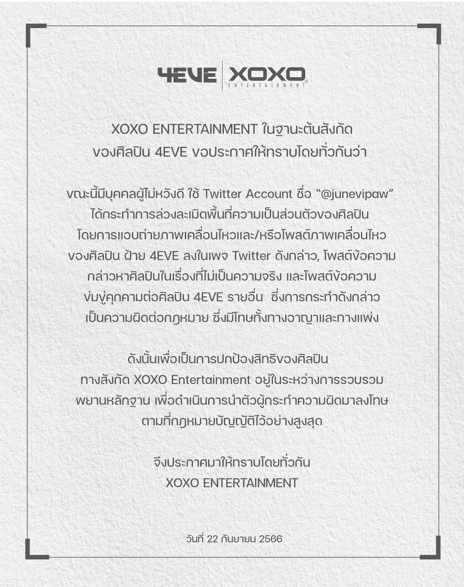 เตรียมดำเนินคดีเอาผิดผู้ไม่หวังดีให้ถึงที่สุด สำหรับ XOXO ENTERTAINMENT ต้นสังกัดของศิลปินชื่อดัง 4EVE หลังมีผู้ไม่หวังดี ละเมิดพื้นที่ความส่วนตัวของศิลปิน โดยมีการแอบถ่ายภาพเคลื่อนไหว หรือโพสต์ภาพเคลื่อนไหวของศิลปินในโซเชียล รวมถึงโพสต์ข้อความกล่าวหาศิลปินในเรื่องที่ไม่จริง และโพสต์ข่มขู่คุกคามอีกด้วย