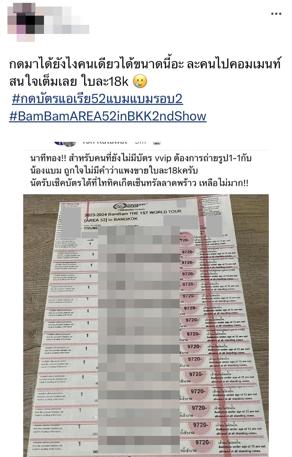เพิ่งประกาศเพิ่มรอบบัตรคอนเสิร์ตไปได้ไม่นาน สำหรับศิลปินหนุ่มหล่อสุดฮอต "แบมแบม กันต์พิมุกต์ ภูวกุล" หรือ "แบมแบม GOT7" ในคอนเสิร์ตเวิลด์ทัวร์เดี่ยวครั้งแรกในประเทศไทยกับคอนเสิร์ต “2023-2024 BamBam THE 1ST WORLD TOUR [AREA 52] in BANGKOK” ซึ่งล่าสุดเหล่าอากาเซ่ก็เพิ่งทำสงครามแย่งชิงการกดบัตรรอบสองกันไปอย่างคึกคัก แต่ปรากฏว่าแฟนๆ หลายคนได้มีการโพสต์ระบายและแจ้งปัญหาของการกดบัตรคอนเสิร์ตในครั้งนี้ไว้ว่าบัตรหลายโซนขายหมดอย่างรวดเร็ว โดยเฉพาะโซน VVIP ซึ่งพบว่าบางคนสามารถกดบัตรได้เกินจำนวนที่ระบบกำหนด และถูกนำมาขายในราคาที่อัพสูงขึ้นเป็นเท่าตัว จากหลักพันเป็นหลักหมื่นกันเลยทีเดียว