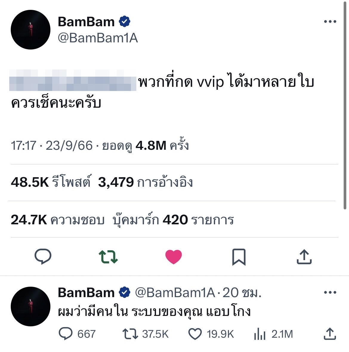 ต่อมา "แบมแบม" ก็ได้มีการโพสต์ข้อความ พร้อมทั้งแท็กทางเว็บไซต์กดบัตรว่า 'พวกที่กดบัตร vvip ได้มาหลายใบควรเช็คนะครับ' และแสดงความคิดเห็นเพิ่มเติมใต้โพสต์อีกว่า 'ผมว่ามีคนในระบบของคุณแอบโกง'