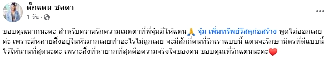 และในเฟซบุ๊กของสาวตั๊กแตนก็ได้โพสต์ข้อความขอบคุณแฟนคลับอีกว่า “ขอบคุณมากนะคะ สำหรับความรักความเมตตาที่พี่จุ๋มมีให้แตน จุ๋ม เพิ่มทรัพย์วัสดุก่อสร้าง พูดไม่ออกเลยค่ะ เพราะมีหลายสิ่งอยู่ในหัวมากเลยทำอะไรไม่ถูกเลย จะมีสักกี่คนที่รักเราแบบนี้ แตนจะรักษามิตรที่ดีแบบนี้ไว้ให้นานที่สุดนะคะ เพราะสิ่งที่หายากที่สุดคือความจริงใจของคน ขอบคุณที่รักแตนนะคะ”