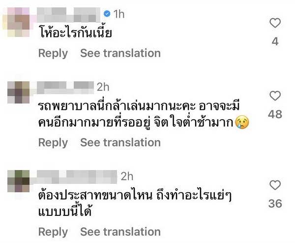 งานี้เลยมีทั้งเพื่อนๆ และแฟนคลับเข้ามาแสดงความคิดเห็นเกี่ยวกับเรื่องนี้อย่างต่อเนื่อง อาทิ.. รถพยาบาลนี่กล้าเล่นมากนะคะ อาจจะมีคนอีกมากมายที่รออยู่ จิตใจต่ำช้ามาก , ต้องเป็นคนที่ไม่ชอบน้อง มีปัญหากับน้องแน่ๆ ค่ะ ก่อกวน แกล้ง แย่มาก ๆ คนแบบนี้ หาตัวคนที่แกล้งก่อกวนให้ได้เร็วๆ นะคะ จัดการมันนนน!!! , ต้องประสาทขนาดไหน ถึงทำอะไรแย่ๆแบบบนี้ได้ , คนที่ทำนี่แย่มากนะคะ เล่นกับรถ.รพ เลยเหรอ ฯลฯ
