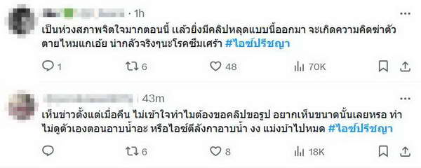 โดยความคิดเห็นสว่วนใจจะไปในทิศทางเดียว เช่น มีคนใกล้ตัวเป็นห่วงนางบ้างไหม ป่วยซึมเศร้ามีโอกาสเป็นแบบนี้ได้ง่าย เบลอ เผลอ เซฟตัวเองไม่เป็น , อย่าแชร์วาร์ป อย่าอยากดูคลิปเลย เขาจะตั้งใจหรือไม่ ก็อย่าไปดู ตอนนั้นเขาอาจจะไม่ทันคิด หรือเมายาซึมเศร้าก็ได้ , รู้ว่าเขาไม่สบายก็อย่าไปซ้ำเติมด้วยการโพสต์คลิป แชร์คลิปเนาะ ฯลฯ