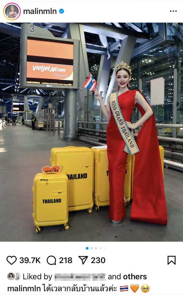 เมื่อช่วงค่ำวานนี้(7ต.ค.) หลิน มาลิน ชระอนันต์ มิสแกรนด์ไทยแลนด์ 2024 พร้อมคณะผู้เข้าประกวด มิสแกรนด์ อินเตอร์เนชั่นแนล ชุดแรกเดินทางกลับจากประเทศ กัมพูชา ถึงท่าอากาศยานนานาชาติสุวรรณภูมิ เรียบร้อยแล้ว โดยมีแฟนนางงามรอให้การต้อนรับ