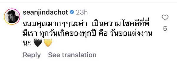 โดยที่หนุ่ม ฌอห์ณ ก็ได้เข้ามาคอมเมนต์ต่อว่า "ขอบคุณมากๆๆนะค่า เป็นความโชคดีที่พี่มีเรา ทุกวันเกิดของทุกปี คือ วันขอแต่งงานนะ "