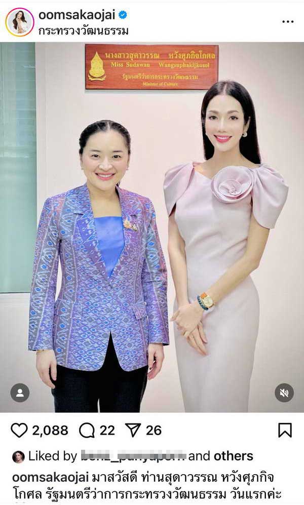 ล่าสุดนักแสดงสาว อ๋อม สกาวใจ ได้โพสต์ภาพแรกในการทำงานที่กระทรวงวัฒนธรรม พร้อมเข้าพบ มาสวัสดี ท่านสุดาวรรณ หวังศุภกิจโกศล รัฐมนตรีว่าการกระทรวงวัฒนธรรม
