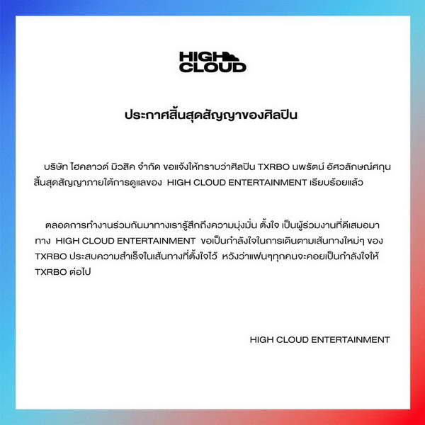 โดยทางค่ายได้โพสต์หนังสือแจ้ง พร้อมข้อความว่า "High Cloud Entertainment ขอแจ้งให้ทราบอย่างเป็นทางการว่าทั้ง 5 ศิลปิน ได้แก่ WHAWHA, J JAZZSPER, TXRBO, BOOM BOOM CASH และ ZOM MARIE ได้สิ้นสุดสัญญาการเป็นศิลปินภายใต้สังกัด High Cloud Entertainment เรียบร้อยแล้ว
