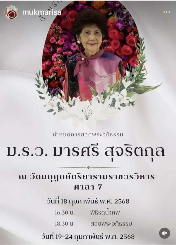 โดยที่ มุก มาริษา ได้โพสต์ข้อความผ่านอินสตาแกรมส่วนตัวว่า "ขออนุญาติแจ้งข่าวค่ะ คุณแม่(หม่อมราชวงศ์ มารศรี สุจริตกุล) ได้จากไปแล้วอย่างสงบเมื่อบ่ายนี้ค่ะ เวลา 1308 ..เวลามันช่างตรงจริงๆ คุณแม่เกิดวันที่13สิงหาคมค่ะ"
