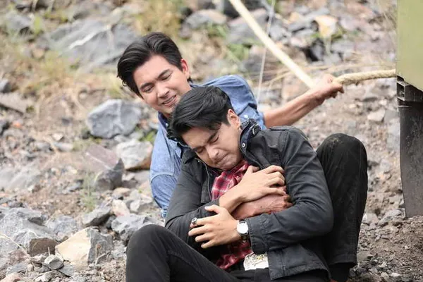 โดยฉากนี้เริ่มจากอ๊อฟขับรถตกเขาจนรถค้างอยู่ที่หน้าผา เขาสลบไป จนเมื่อได้สติก็พบว่ารถของตัวเอง ใกล้จะไถลลงเหวไปแล้ว แต่ก็ไม่มีสติพอจะพยุงตัวเองออกมาจากรถได้ เข้มที่มองเห็นเหตุการณ์อยู่บนเขา จึงตัดสินใจค่อย ๆ ไต่ลงจากเขา เข้าไปช่วยอ๊อฟ ซึ่งฉากนี้เข้มขอเล่นเอง เพื่อให้ได้ภาพออกมาสมจริงที่สุด โดยผู้กำกับได้ให้เข้มใส่สลิง เพื่อเซฟตัวเอง ซึ่งเข้มแสดงฉากนี้ออกมาด้วยความเท่ และทะมัดทะแมง ผ่านไปได้ด้วยดี สมใจผู้กำกับ เรียกว่างานนี้ภาพออกมาหล่อเท่จนอ๊อฟเอ่ยปากชมในความเก่งของเข้มทีเดียว