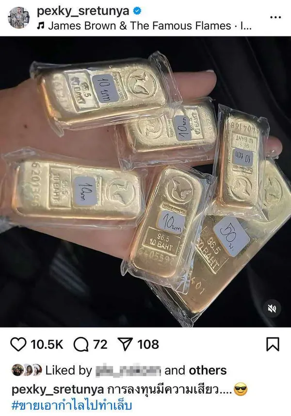 ไม่ธรรมดา เป็กกี้ ศรีธัญญา นักร้องสาว โสด สวย และรวยมาก! โพสต์อวด ทองคำแท่ง น้ำหนักรวม 100 บาทถ้วน! ที่นำออกมาขายเพื่อทำกำไร ได้เท่าไรไม่ชัดเจน แต่เจ้าตัวบอกจะเอาไปทำเล็บ ทำชาวเน็ตแซวสนั่น