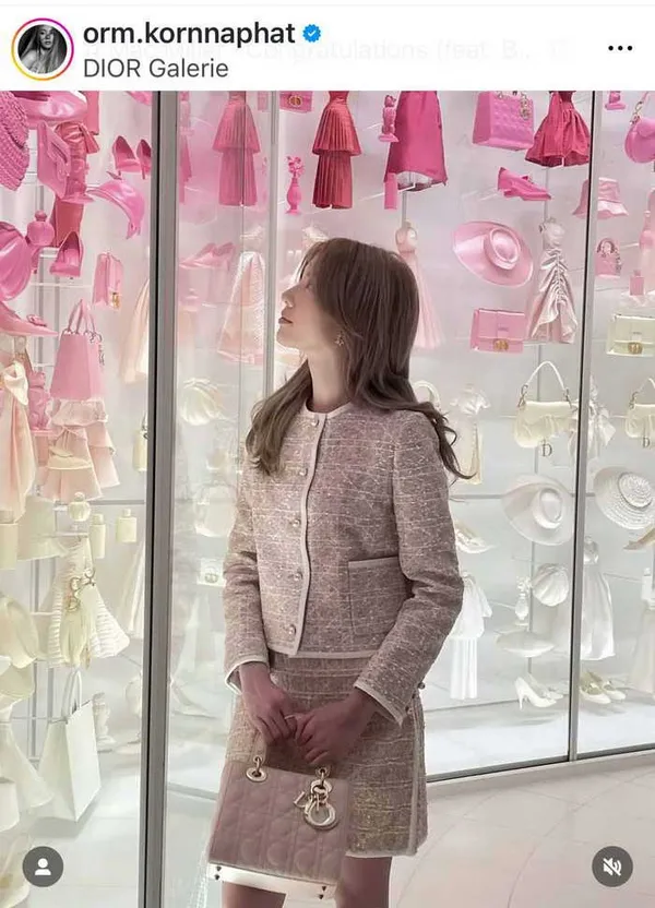 ในขณะที่ทางด้านของ ออม กรณ์นภัส สวมเสื้อแจ็กเก็ตและกระโปรงสั้น Dior ในคอลเล็กชัน Macrocannage เช่นเดียวกัน สี Blossom Pink เสริมด้วย กระเป๋า Lady Dior สีชมพูพาสเทล ที่เข้ากันอย่างไร้ที่ติ ประดับด้วย รองเท้าส้นสูงสีขาว ที่ช่วยเสริมความสง่างามและเรียบหรูในทุกย่างก้าว เธอแสดงออกถึงความเป็น Dior Woman ที่สง่างามและเต็มไปด้วยเสน่ห์อันน่าหลงใหล