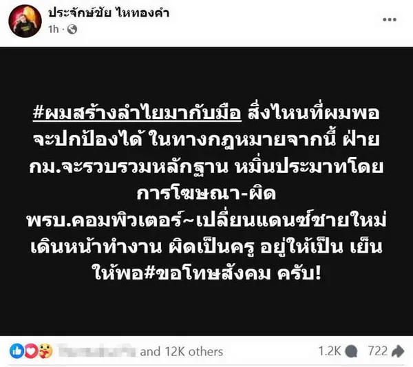 ล่าสุดนายห้างใหญ่ ประจักษ์ชัย ไหทองคำ ออกมาเคลื่อนไหว แตะเบรคชาวเน็ต พร้อมปกป้องศิลปินในค่าย ด้วยการโพสต์ข้อความผ่านเฟซบุ๊กส่วนตัวว่า..