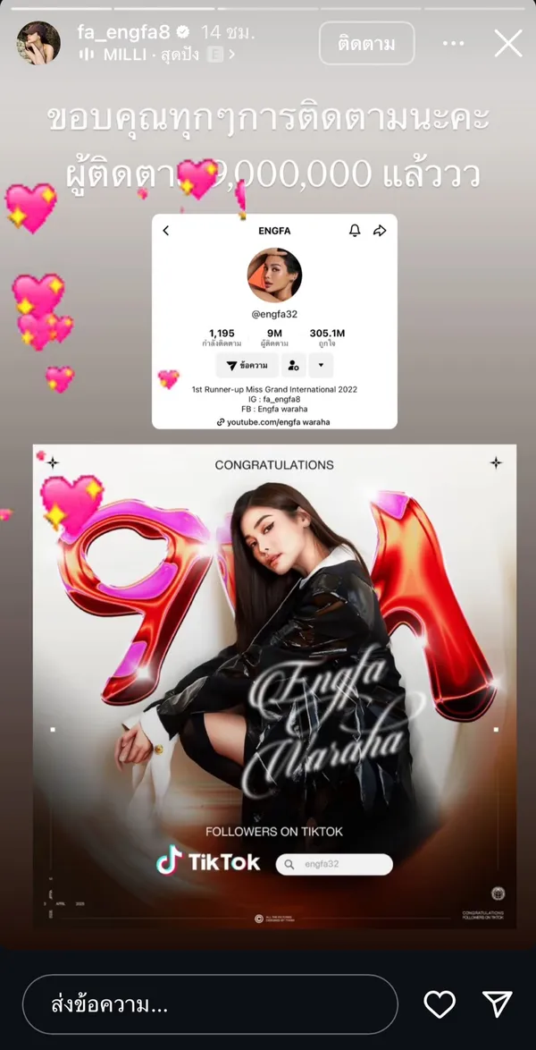 เรียกว่าเป็นอีกหนึ่งสาวมากความสามารถสำหรับ "อิงฟ้า วราหะ" ที่ไม่ว่าจะทำอะไรก็ฮอต ปัง อยู่เสมอ ล่าสุดยังมีผลงานภาพยนตร์อย่าง "วิมานหนาม" ที่ทำเอาบทบาทของ "โหม๋" กลายเป็นที่จดจำ ซึ่งความฮอตของเธอนั้นไม่ได้ปังแค่ในประเทศเท่านั้น แต่ยังเดินทางออกงานต่างประเทศแบบรัวๆ เสิร์ฟความน่ารักให้กับแฟนคลับเสมอๆ พร้อมทั้งยังได้เห็นโมเมนต์ดีๆ ของสาว "อิงฟ้า" ที่มีให้กับแฟนคลับเสมอมา ไม่แปลกใจที่เธอจะมีผู้ติดตามเป็นจำนวนมาก ล่าสุดเธอยังได้โพสต์ไอจีสตอรี่อีกหนึ่งเรื่องน่ายินดี เพราะใน TikTok ของเธอในตอนนี้มีผู้ติดตามสูงถึง 9 ล้านคนแล้ว