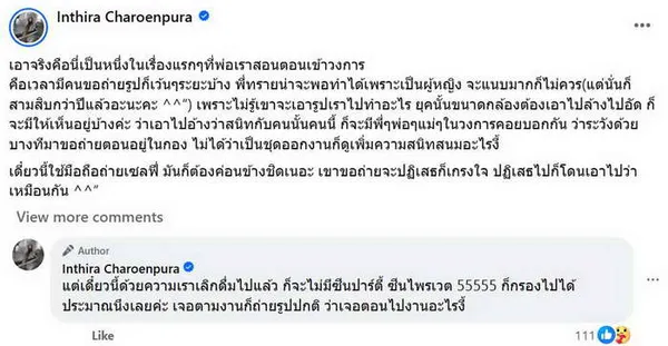 เกี่ยวกับเรื่องนี้นักแสดงรุ่นพี่อย่าง ทราย อินทิรา เจริญปุระ นางเอกร้อยล้านผู้มาก่อนกาล และอยู่ในวงการมาอย่างยาวนาน ได้ออกมาแสดงความคิดเห็น ด้วยการโพสต์ข้อความว่า..