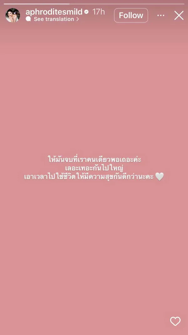 และล่าสุด มายด์ พัชรบุษย์ ก็โพสต์ไอจีสตอรี่เป็นข้อความว่า "ให้มันจบที่เราคนเดียวพอเถอะค่ะ เลอะเทอะกันไปใหญ่ เอาเวลาไปใช้ชีวิตให้มีความสุขกันดีกว่านะคะ"